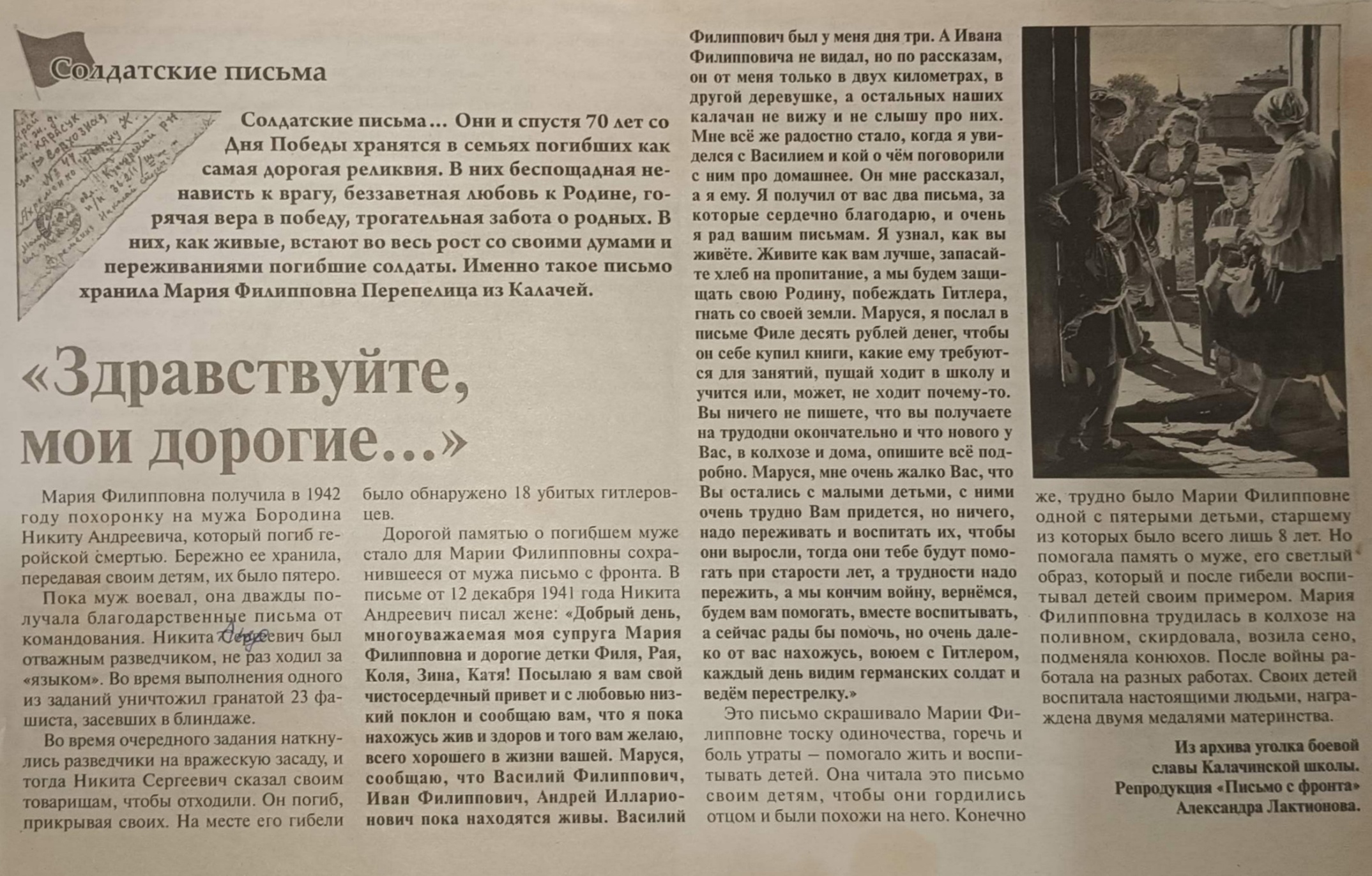 «Добрый день, многоуважаемая моя супруга Мария Филипповна и дорогие детки Филя, Рая, Коля, Зина, Катя! Посылаю я вам свой чистосердечный привет и с любовью низкий поклон и сообщаю вам, что я пока нахожусь жив и здоров и того вам желаю, всего хорошего в жизни вашей. Маруся, сообщаю, что Василий Филиппович, Иван Филиппович, Андрей Илларионович пока находятся живы. Василий Филиппович был у меня дня три. А Ивана Филипповича не видал, но, по рассказам, он от меня только в двух километрах, в другой деревушке, а остальных наших калачан не вижу и не слышу про них.