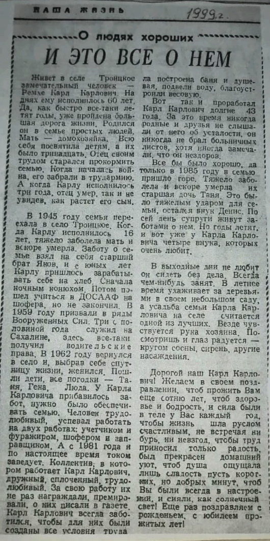 Вырезки из газет играют важную роль в архиве, поскольку они отражают культурные события и достижения, важные для семьи. Много писали о моём дедушке Карле Карловиче. Он был заведующим зернотоком и еще десять лет после выхода на пенсию работал на благо колхоза имени Дзержинского. Журналисты писали и о трудовых династиях моей семьи.