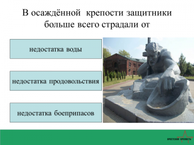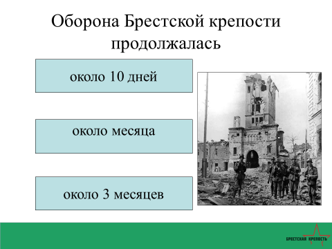 13. Немецкое командование рассчитывало захватить крепость в течение нескольких часов, но 45-я дивизия вермахта застряла в Бресте на неделю и со значительными потерями ещё целый месяц подавляла отдельные очаги сопротивления героев-защитников.... В результате … крепость стала символом мужества, героической стойкости и доблести времён Великой Отечественной войны. (Брестская крепость)