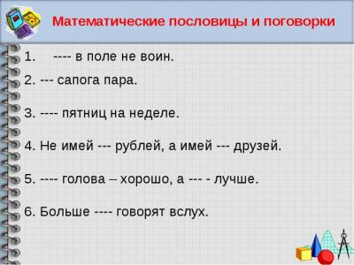 В начальной школе активно используются ребусы, пословицы и поговорки, которые также можно успешно интегрировать в уроки математики. Например, при изучении единиц измерения времени можно использовать ребусы, связанные с днями недели, и пословицы, такие как «Летом одна неделя год кормит» или «На час опоздал – за год не догонишь». Такой подход оживляет учебный процесс, повышает мотивацию к обучению и способствует лучшему усвоению материала. Использование пословиц, поговорок и ребусов делает уроки математики более увлекательными и эффективными для младших школьников с интеллектуальными нарушениями.