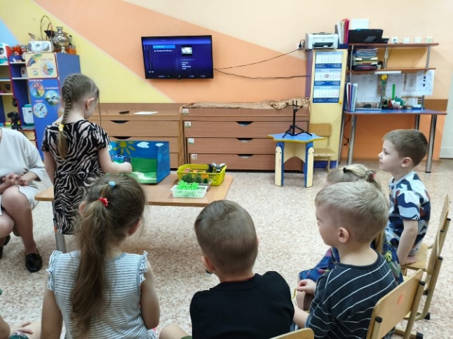 В. Ребята, мы с вами были операторами и сняли мультфильм, но мне нужно записать наши фотографии на плёнку, а вам немножечко подождать, и мы увидим, что у нас получилось. Проходите в наш кинозал, занимайте места (воспитатель показывает детям заранее снятый фрагмент мультфильма, без звука).