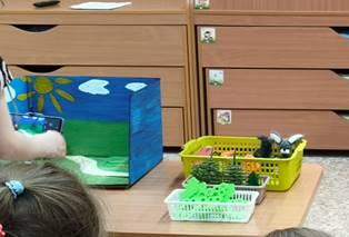 Домик стоял где? (в лесу), лес какой? Что растёт в лесу? (Дети описывают лес, деревья, выбирают фигурки и ставят в декорации…) Ставим лес и фотографируем.