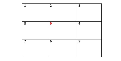 Начать можно как с первого квадрата, так и с любого другого. Центральным является квадрат с номером 9. Обычно же нужно установить связи по периметру между квадратами 1-2, 2-3, 3-4, 4-5, 5-6, 6-7, 7-8, 8-9, а также по центральному кресту между квадратами 2-9, 6-9, 8-9 и 4-9.