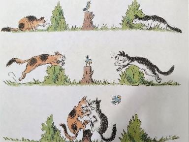 Приведу пример с пословицей Видит глаз далеко, а ум ещё дальше. В одном случае ребёнок нарисовал мозг и глаза на дороге, где мозг проходит большее расстояние, чем глаз. На другом рисунке ребёнок предусмотрел исход жизненной ситуации: по дороге идут люди, у одного из них на пути лежит камень, а другой предупреждает его об опасности. В третьем случае ребёнок изобразил учёного кота с книгой как символ того, что знания (ум) дают человеку больше возможностей познания мира (рисунки 2-4).
