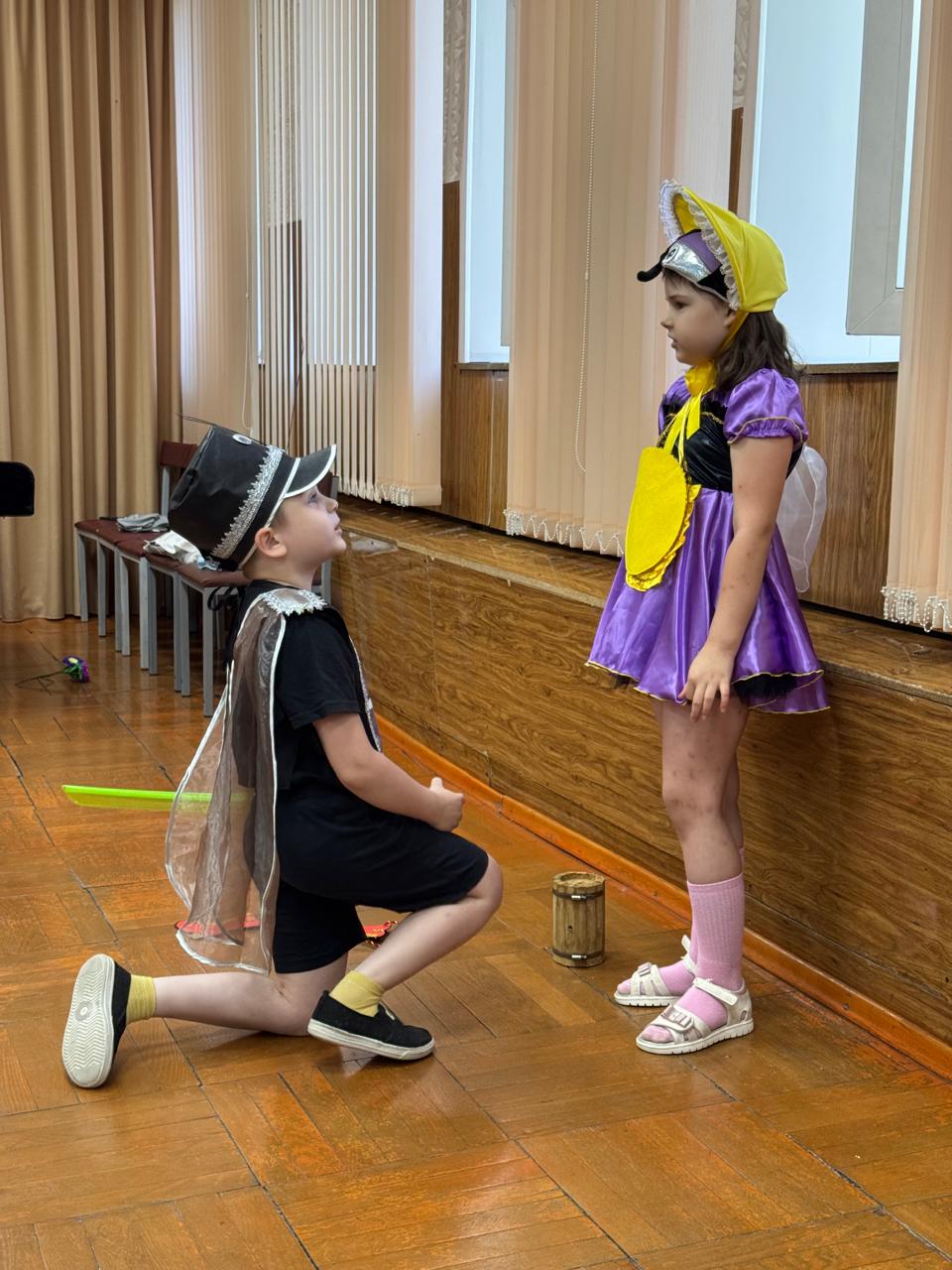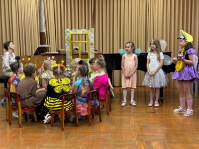 Все остальные персонажи: бабочки, блошки, пчелки, таракан также очень важны. Они – не массовка, а полноценные персонажи, которые веселятся на празднике Мухи, лакомятся за столом, хотят заступиться за хозяйку, но боятся «паука-злодея», а в конце искренне радуются победе Комара и освобождению Мухи. У них есть реплики, достаточно сложные и красивые песни, не уступающие по сложности песням главных персонажей. Если детей много, я бы сделала несколько бабочек, пчелок, блошек, чтобы каждый ребенок обязательно поучаствовал.