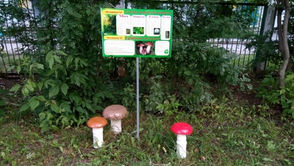 – Пространства для познания природы, часто называемые экологическими тропами, формируются из различных наблюдательных объектов. К ним относятся отдельные деревья, кустарниковые насаждения, участки с травой, цветники, игровые зоны с песком, коллекции сорных трав, газоны, искусственные укрытия для насекомых и птиц, кормушки, бревна, большие камни, альпинарии, сады для развития сенсорного восприятия, огороды и другие элементы ландшафтного дизайна.
