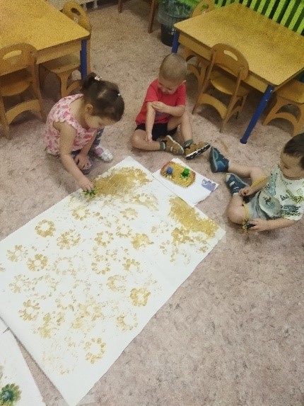 Для этого можно применять, например, пробочку, поролоновый тампон, обратную сторону карандаша, ладошку. Также в качестве печатных штампов используют природные материалы: шишки, мох, колоски различных трав, листья.