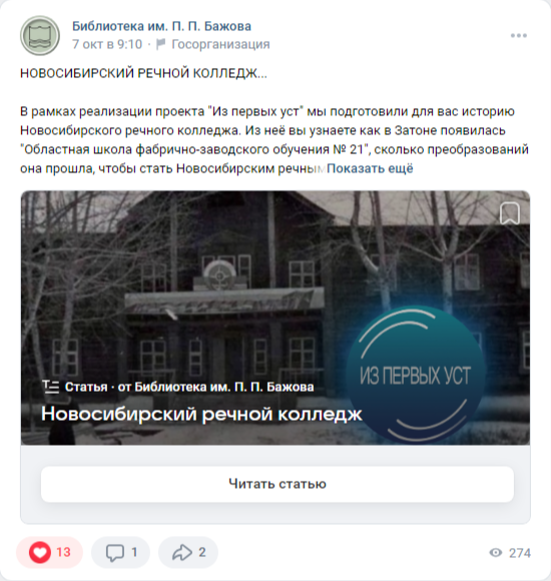 Помимо живых воспоминаний людей мы поднимали архивные документы и писали статьи о знаковых местах Затона, таких как Новосибирский речной колледж, судоремонтный завод, больница в Затоне, библиотека.