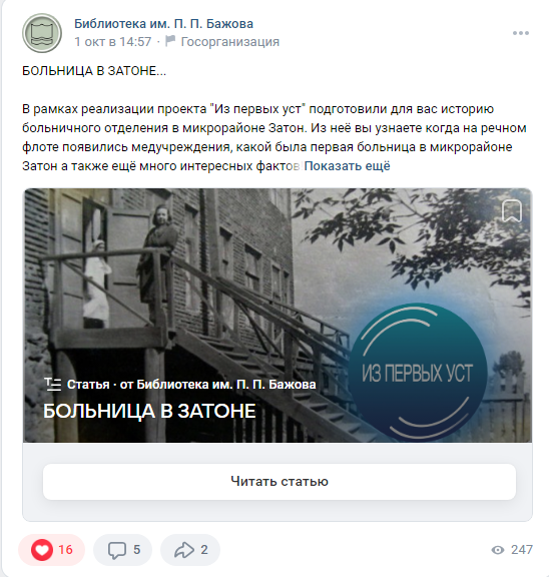 Мы записали цикл видеоинтервью с коренными жителями микрорайона Затон. У нас получилось 17 интервью с жителями, два экспертных ролика (с краеведами нашего города – Голодяевым Константином Артёмовичем и Романовым Павлом Игоревичем), один спецвыпуск с экскурсией по Затону и фильм о проекте от команды. Также мы брали фотографии у жителей и на основе их историй и фотоснимков делали посты с инфографикой про каждого героя выпуска.