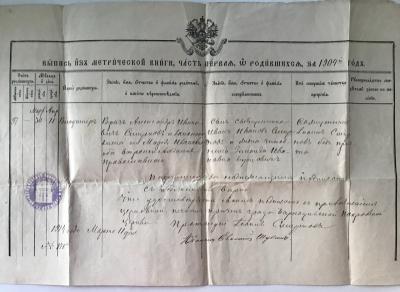 Выпись из метрической книги о рождении у А. И. Смирнова и его жены Марии Ивановны сына Владимира. Фото из семейного архива предоставлено Ириной Егошиной
