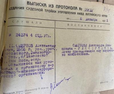 Все заслуги его перед здравоохранением и городом были забыты в 1937-м. Дело, хранящееся в спецхране ГААК, для потомков Смирновых представляет из себя «два в одном»: в нем содержатся документы об Александре Ивановиче и его сыне Сергее – двоих из четырнадцати осужденных.