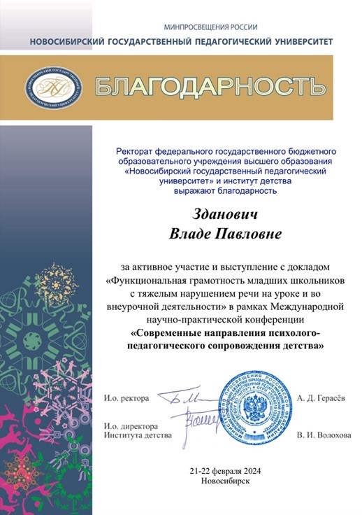 Началом профессионального становления стало обучение на курсах и семинарах, охватывающих широкий спектр тем, актуальных для инклюзивного образования. Особую ценность имели курсы по прикладному анализу поведения (ABA-терапии), углубленное изучение основ нейрологопедии, а также участие в программе «Организация образовательной деятельности по адаптированным общеобразовательным программам для обучающихся с ОВЗ». Эти знания позволили мне более эффективно выстраивать образовательный процесс, учитывая индивидуальные особенности каждого ребенка.