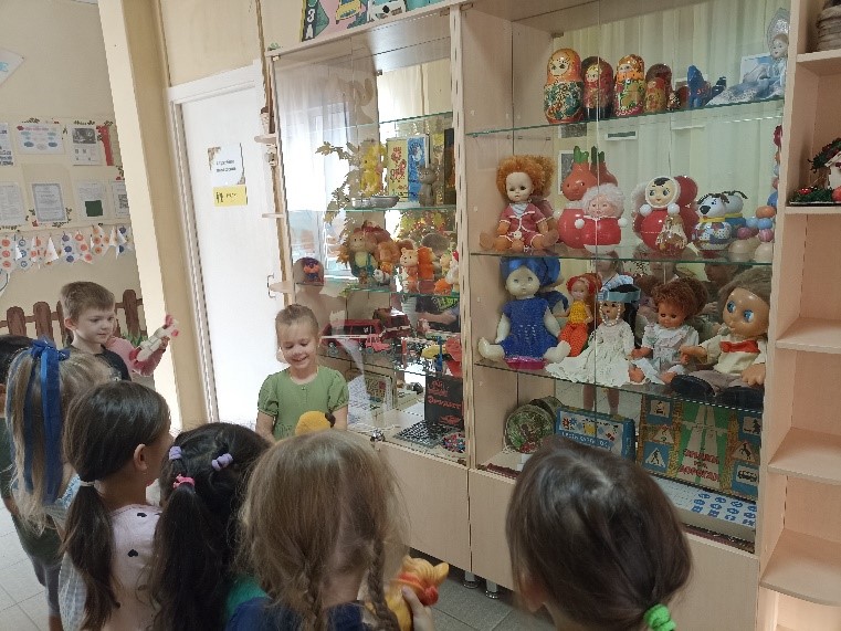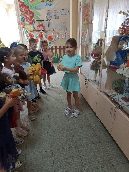 Вопрос к детям: «Ребята, хотите посетить выставку игрушек и узнать что-то очень интересное?» (вместе с воспитателем дети идут к музейной экспозиции, которая находится в холле детского сада, предварительно обговорив правила поведения в музее).