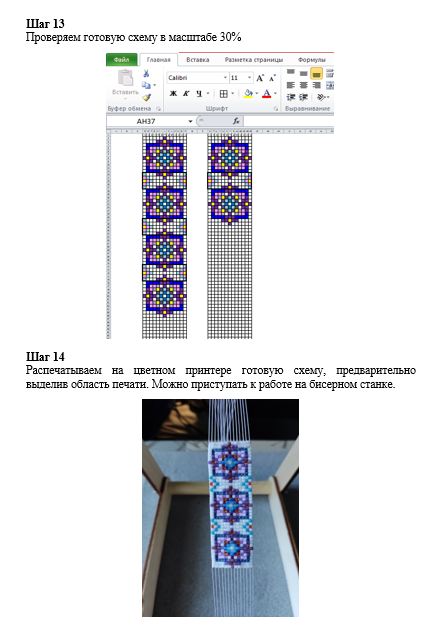 Все, кто работал в технике «бисероткачество», знают, как сложно составить авторскую схему для гердана. Работая привычным способом, составляя рисунок на бумаге в клетку цветными фломастерами, тратится очень много времени и сил. А самое главное – очень сложно исправить ошибку. Приходится всё перерисовывать и начинать работу заново. Чтобы решить эту проблему, мною был разработан авторский метод составления цветных схем для бисероткачества с помощью программы Microsoft Excel. Для педагогов города декоративно-прикладной направленности был проведён мастер-класс по данной теме: https://vk.com/wall-197269264_1709.