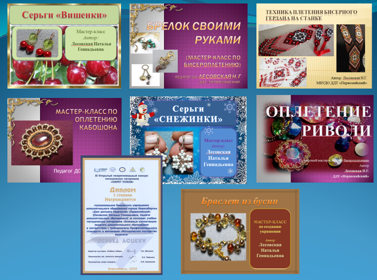 Для занятий в нашем объединении мною был разработан авторский учебно-методический комплекс по бисероплетению, в который вошли учебные таблицы, мастер-классы, схемы, альбомы с образцами готовых работ. Данный комплекс был отмечен дипломом 1 степени XI Открытого межрегионального конкурса методических материалов «Секрет успеха» в номинации «Методическое мастерство педагога» в 2021 году.