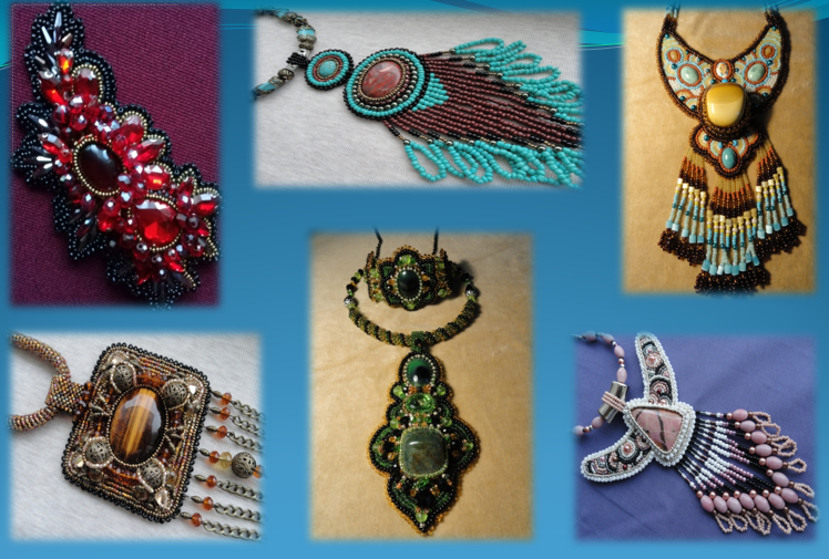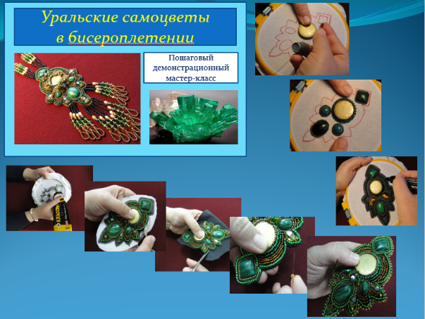 Первым опытом работы в таком формате стал демонстрационный мастер-класс «Уральские самоцветы». На каждых отдельных пяльцах мне пришлось проработать все этапы создания бисерного украшения: от эскиза до готовой работы.