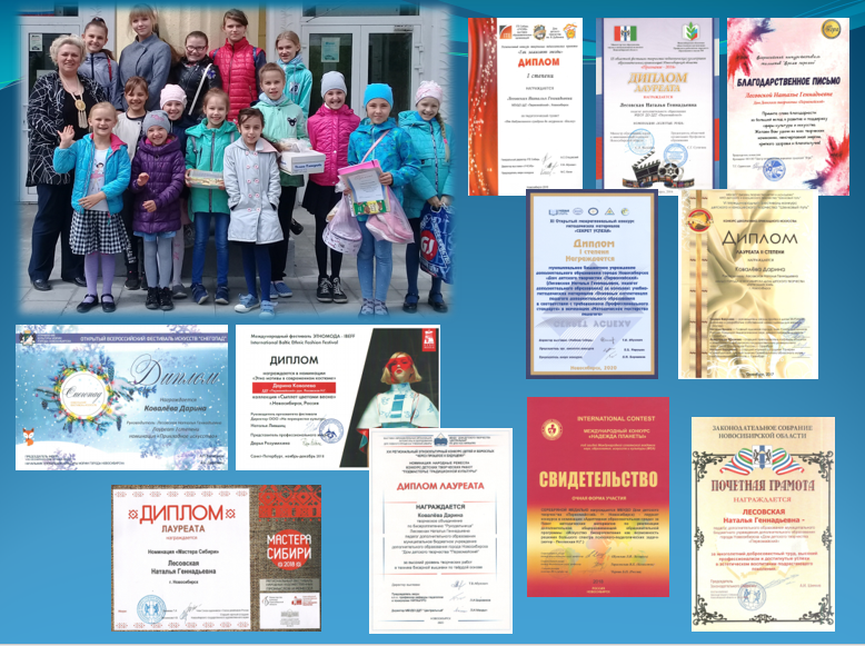 Результаты работы радуют. Наше объединение «Рукодельница» с 2022 года носит звание «Образцовый (народный) самодеятельный коллектив Новосибирской области». В творческой копилке объединения «Рукодельница» имеются Гран-при и лауреатские звания международного, всероссийского, межрегионального и городского уровней. За большую методическую работу как педагог и методист в 2023 году я удостоена диплома победителя конкурса профессионального мастерства под эгидой министерства образования Новосибирской области «Лучший педагогический работник в 2023 году».