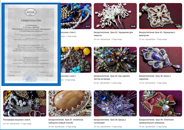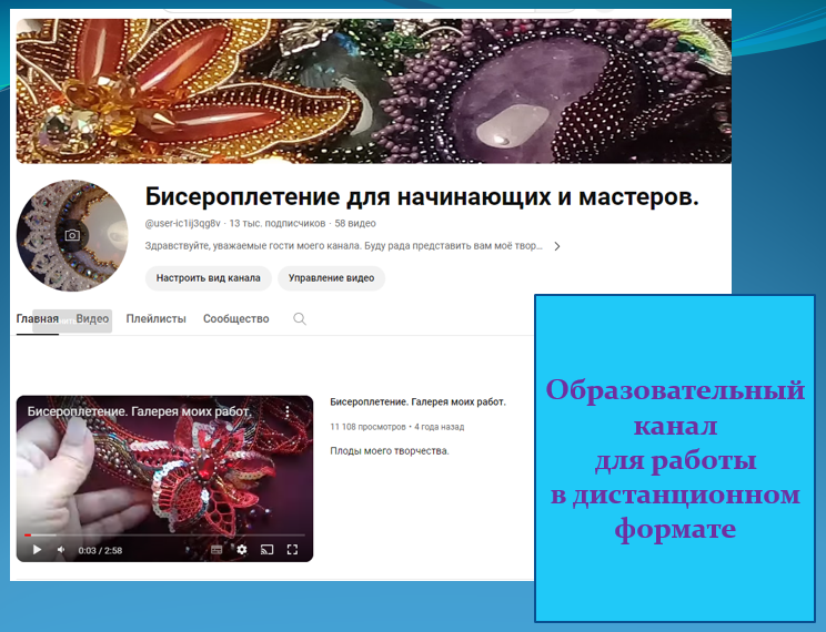 Для работы с особо одарёнными обучающимися, у которых есть запрос на работу по индивидуальному маршруту, в 2019 году был разработан образовательный канал «Искусство бисероплетения с Натальей Лесовской», контент которого был размещён на платформе «RUTUBE»: https://rutube.ru/channel/24410024/. Канал дал мне возможность во время пандемии коронавируса продолжать работу не только с детьми нашего объединения, но и со всеми желающими.