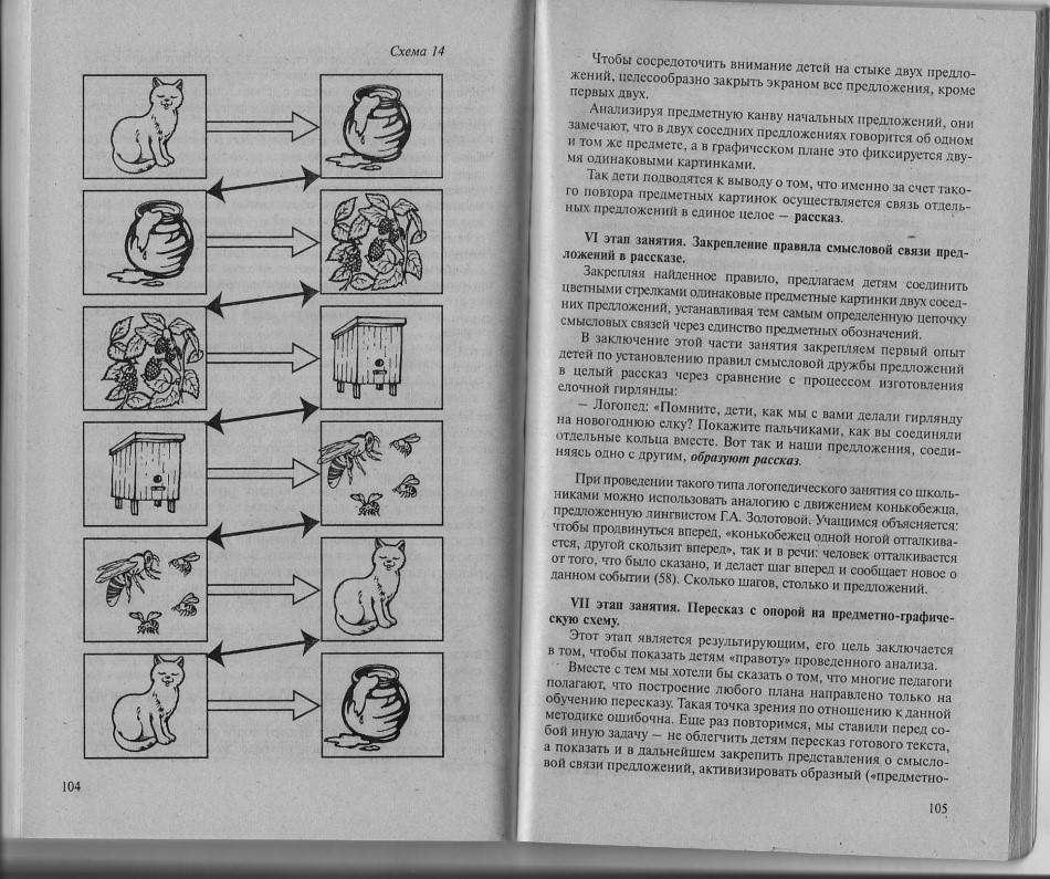 На этапе формирование коммуникативных умений и навыков для развития связной, грамматически правильной монологической речи наряду с приемами, описанными в работах В.П. Глухова, Т.А. Ткаченко, использую методику В.К. Воробьёвой, где наглядное моделирование представлено как основной метод развития связной речи у данной категории детей. Оригинальным в данной методике является использование не линейных, а вертикальных предметно-графических и сенсорно-графических моделей для работы с текстами цепной и лучевой (параллельной) структуры для формирования навыков повествовательной и описательной связной речи соответственно.