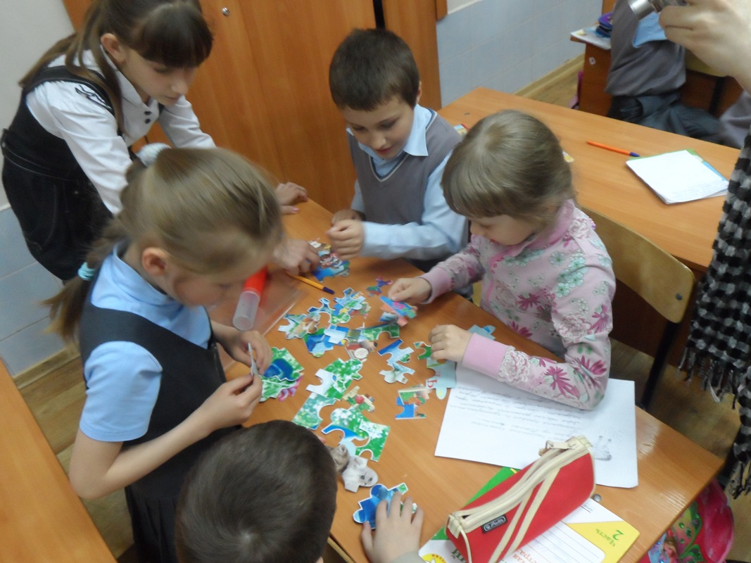 В завершение виртуального путешествия ребята все вместе складывали пазлы «Мамы и зверята», на которых были изображены белые медведи, львята и обезьянки.