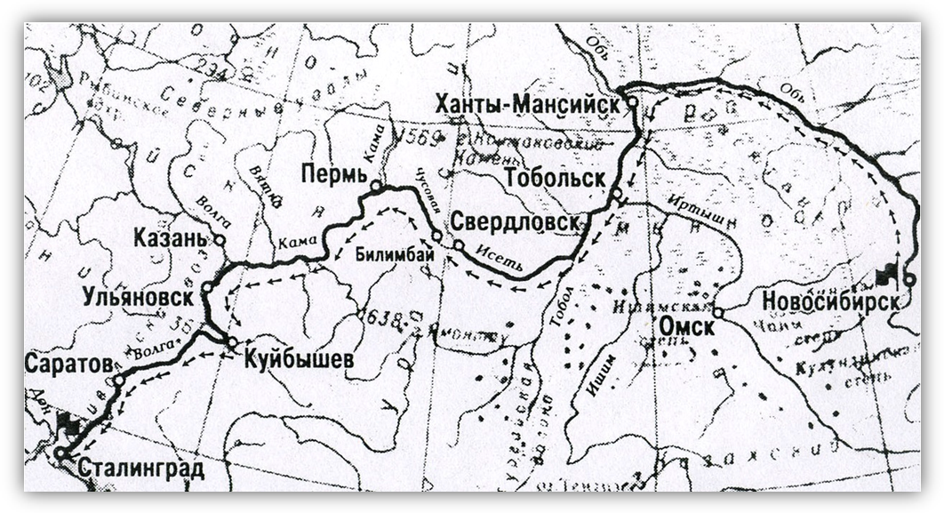 В институтской библиотеке нашли проект, разработанный ещё в дореволюционные годы прогрессивными русскими инженерами, которые мечтали соединить две великие реки – Волгу и Обь. Заинтересовались трассой водного пути, по которой в будущем суда смогли бы ходить из Волги в Обь. Выбирая новый маршрут для своего похода, мы теперь все свое свободное время проводили у карты и думали: «Когда – то по этим уральским речкам проходили дружины Ермака, шедшие из Европы в Азию на покорение Сибирского царства». Остановились на варианте Новосибирск – Сталинград по маршруту: р. Обь, р. Иртыш, р. Тобол, р. Исеть, 50 км волока (в районе Свердловска), р. Чусовая, р. Кама, р. Волга. Закипела работа по подготовке проекта перехода.