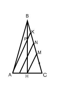 Вначале на интуитивном уровне определяем, каким может быть искомое отношение: кто говорит, что это 1:3, а кто – 1:2. Выясним, кто же прав, решив эту задачу строго математически. Ребята задумываются на некоторое время. Предлагается провести через точки деления М и N прямые, параллельные отрезку АК. Возникает естественный вопрос: почему такая прямая, проведённая через точку М, пройдёт через середину Н основания АС? Объясняют это так: «Так как по точкам деления М будет серединой стороны КС треугольника АКС, то по теореме Фалеса на стороне АС отложатся равные отрезки, то есть АН = НС, что следует из свойств равнобедренного треугольника АВС». А далее «так как ВК = КN, а КN = NМ, то на стороне ВН угла СВН по этой же теореме Фалеса отложатся равные между собой отрезки. Их, этих отрезков, всего три. Значит, высота ВН точкой Р разделилась в отношении 1:2, считая от вершины В».