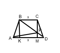 Пусть АВСD – данная трапеция, а точка Р – точка пересечения указанных в условии задачи отрезков. Если обозначить длину верхнего основания ВС трапеции за х, тогда АК = MD = 1 –