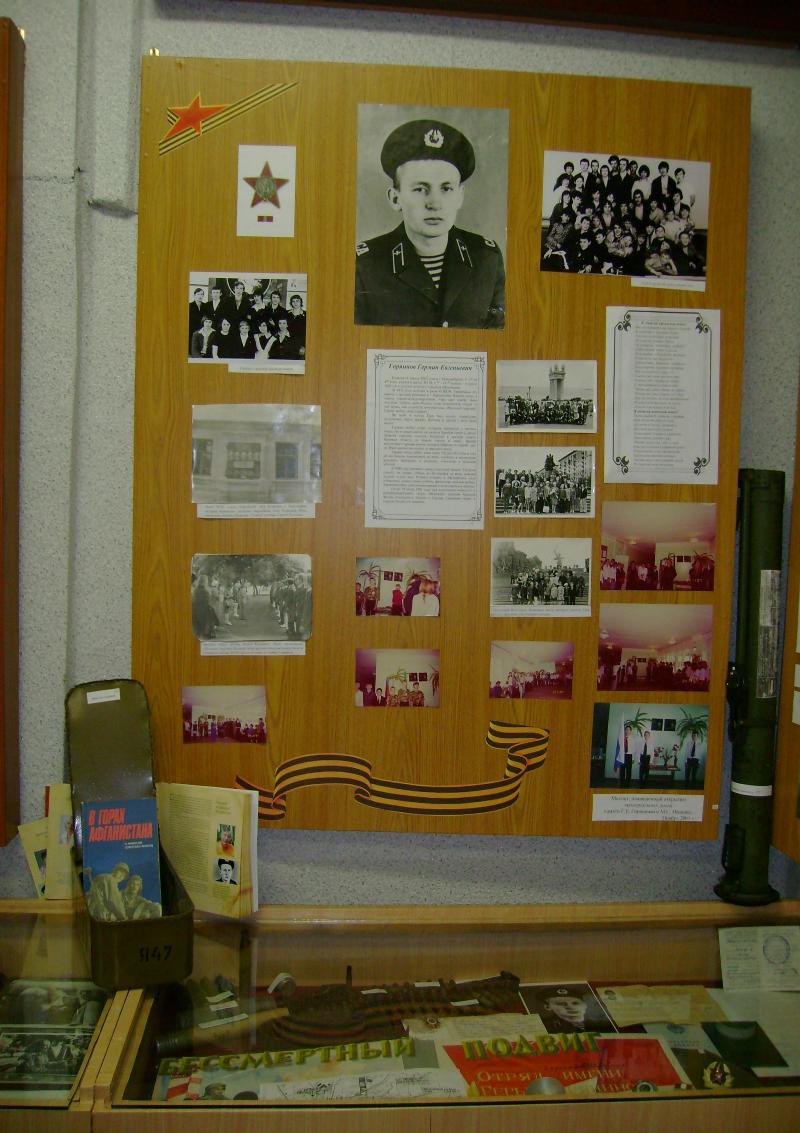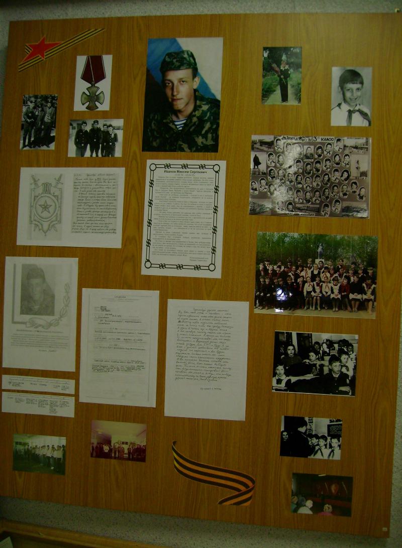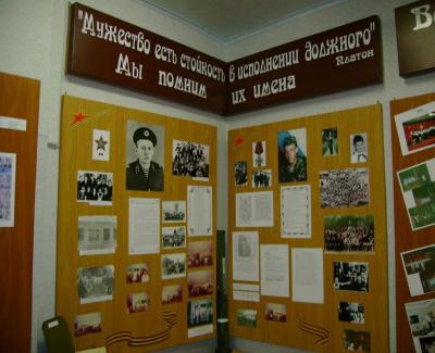 Особой гордостью для музея является уголок боевой славы, где рассказывается о выпускниках нашей школы, погибших в Афганистане и Чеченской республике – Г. Горяйнове и М. Иванове, витрина с их личными вещами, документами и письмами. Также в школе были открыты мемориальные доски в память об этих ребятах.