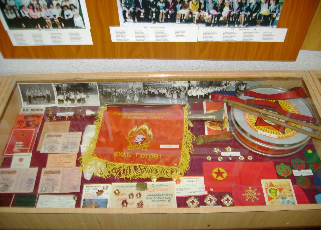 Но всего этого, наверное, недостаточно, чтобы привлечь интерес ребят к музею, поэтому в нём представлены разделы экспозиции, рассказывающие об истории детских общественных организаций (комсомольской, пионерской и октябрятской), о школьном быте (школьные формы, письменные принадлежности и учебники, учебные приспособления, технические средства советских времён).