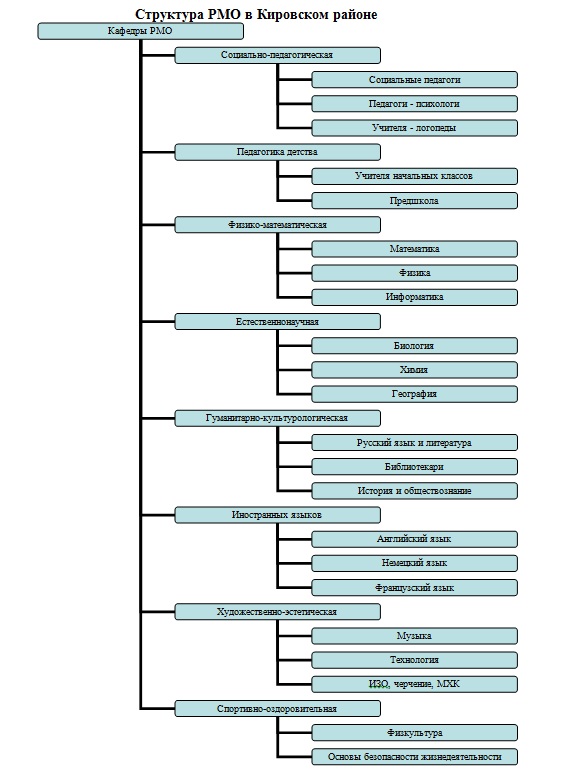 Эффективным средством развития профессиональных компетенций по-прежнему остается работа районных методических объединений учителей-предметников (РМО). В образовательном пространстве Кировского района функционируют 22 районных методических объединения, руководителями которых являются опытные учителя из образовательных учреждений: Лицей Информационных Технологий, гимназия № 7 «Сибирская», школы №№ 41, 49, 64, 109, 134, 192, 196.