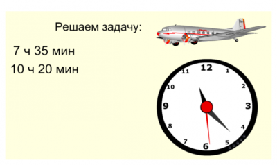 – Как найти время прибытия самолета? (Ко времени его вылета прибавить время, затраченное на путь: 7ч 35мин +10ч 20мин = 17ч 55мин.)