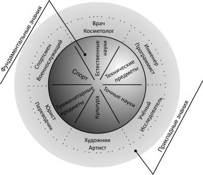 На рисунке 1 представлена схема среднего школьного образования и возможные области специализации выпускников 9-11 классов. Среднее общее образование представлено в виде ядра, состоящего из четко разграниченных областей знания. Самой важной частью здесь является триада гуманитарных, естественных и точных наук. Однако, воспитывая полноценную личность, невозможно ограничиться только тремя составляющими. Все шесть сегментов ядра призваны обеспечить не только разностороннее развитие личности, но и ознакомить ученика с возможными путями дальнейшего развития, чтобы каждый мог выбрать наиболее интересную для него область дальнейшего профессионального роста.