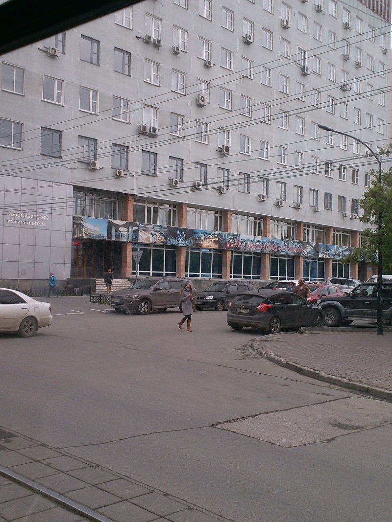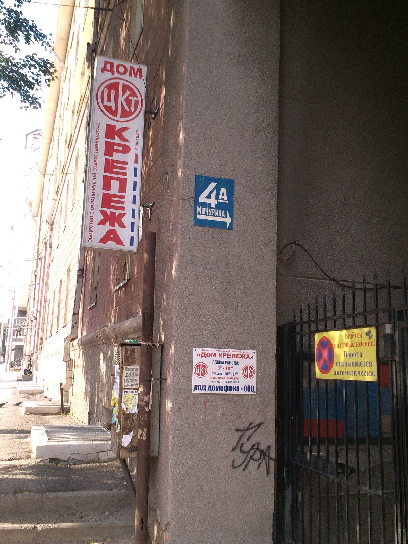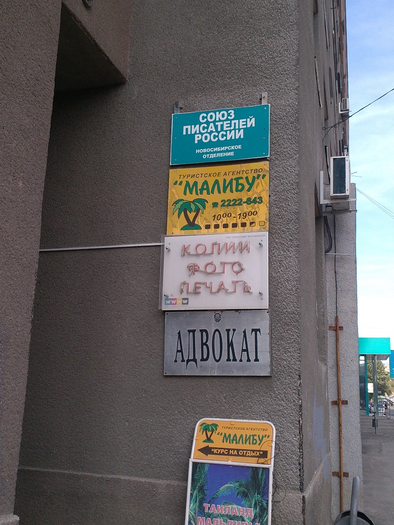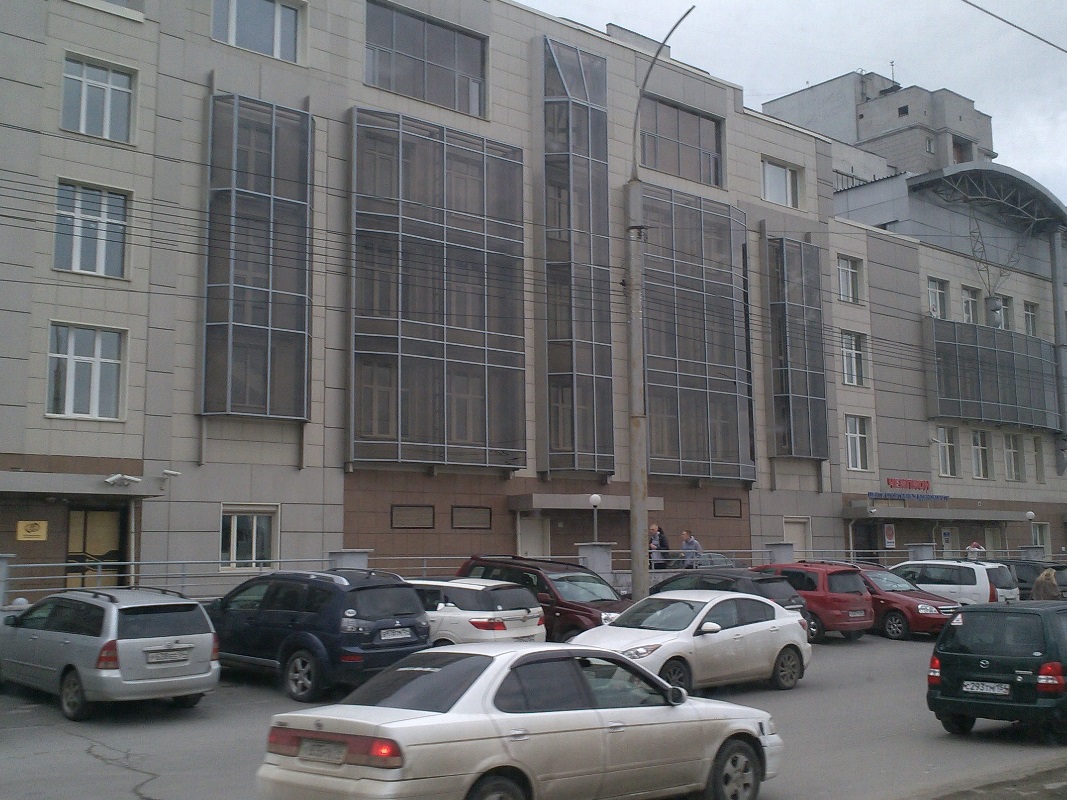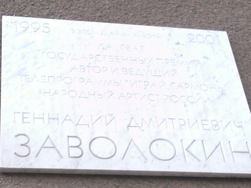 Посмотрите, пожалуйста, направо, перед нами здание по ул. Мичурина 4 А. Здесь располагается Союз писателей России (Новосибирское отделение), а также висит памятная доска, которая гласит, что в этом здании работал лауреат государственных премий, ведущий телепрограммы «Играй, гармонь», народный артист России Геннадий Дмитриевич Заволокин.