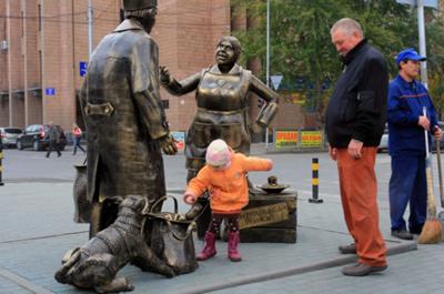 Меня в этом месте привлекает очень интересный объект – скульптура «Продавщица и интеллигент». Роль продавщицы исполняет женщина с внушительным опытом работы в сфере уличной торговли, в роли покупателя – рассеянный интеллигент. Еще один персонаж – собака, ворующая сосиску, подчеркивает юмор ситуации.