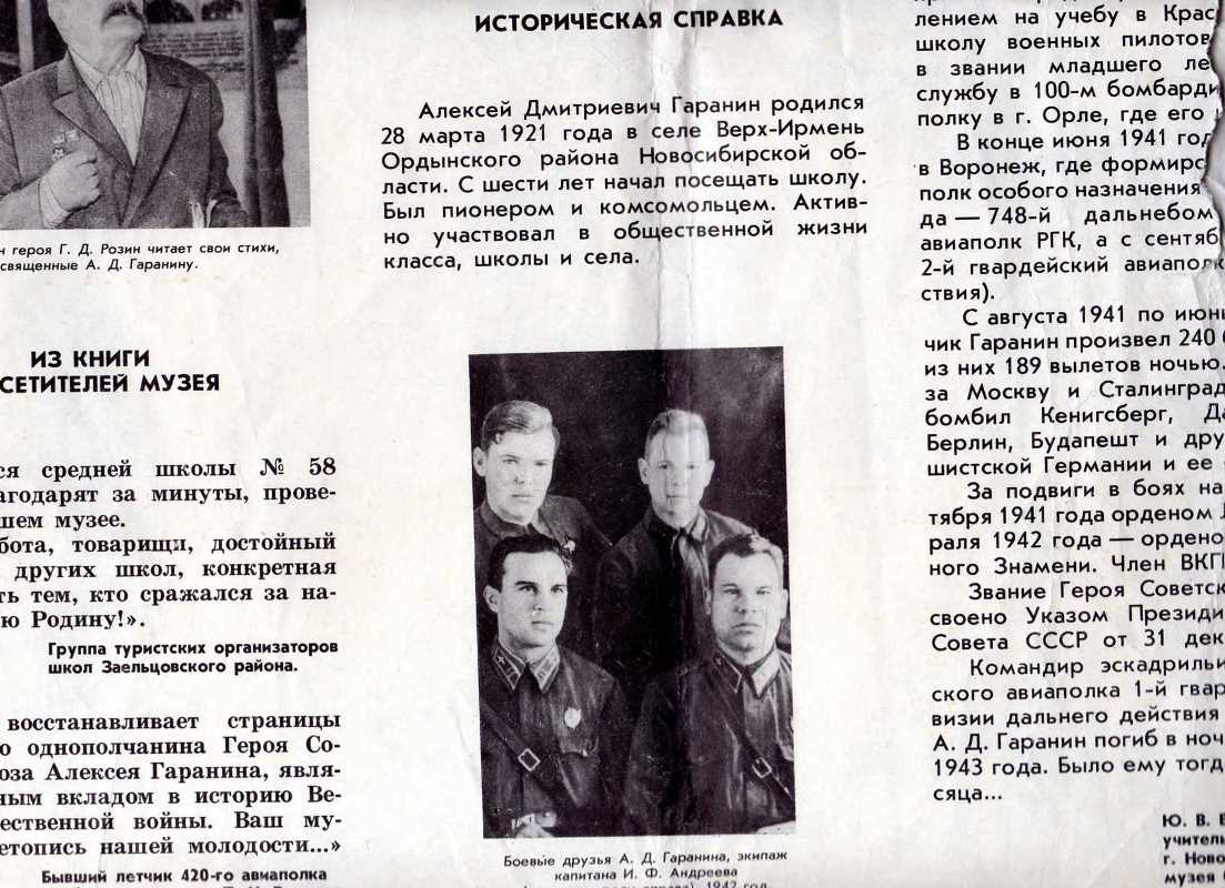Еще в 1976 г., разыскивая ветеранов войны, наши члены поисковых групп вышли на маму Алеши Гаранина, который погиб 28 июня 1943 года и ему было присвоено звание Героя Советского Союза. Он защищал свою Родину и остался навечно молодым, ему было всего 23 года. Мы хотим немного рассказать вам, каким он был по воспоминания мамы и его записям дневников.
