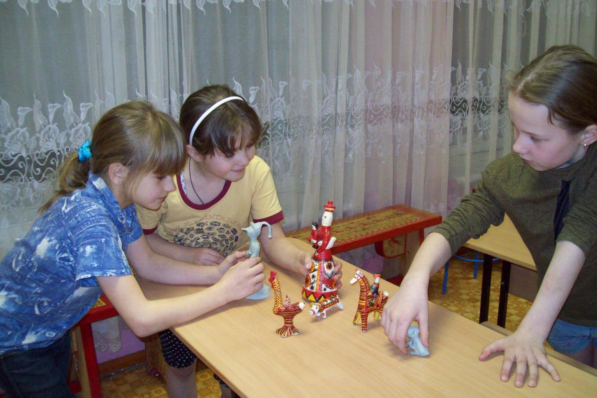 Я работаю педагогом дополнительного образования на базе Детского дома № 9 по программе «Изостудия в детском доме». В творческом объединении «Цвета радуги» дети, лишенные попечения родителей, учатся рисованию, живописи, работе с бумагой. У детей наблюдается задержка психического развития, им особенно полезно знакомство с народным искусством. Педагог Т.Я. Шпикалова отмечает праздничность, мажорность народного искусства, отражающие полнокровное, оптимистичное восприятие окружающего мира. В объединении, которым я руковожу, дети рисуют дымковские, филимоновские игрушки, пробуют лепить по мотивам народных глиняных игрушек, изучают особенности семеновской матрешки.