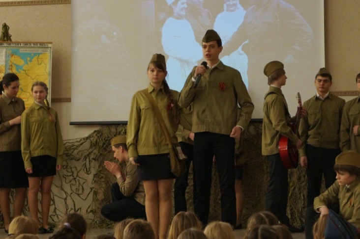 Данную постановку лицеисты показывали неоднократно: на различных мероприятиях, организаторами которых являлись Администрации района и города, в городском Дворце ветеранов, в парках на 9 Мая и День независимости России, с ней стали победителями конкурсов различных уровней. Действие построено на основании документального материала, с опорой на материал школьного музея, в качестве художественного материала использованы стихотворения советских поэтов и песни советских композиторов. Видеоряд мероприятиями представлен отрывками из советских видеофильмов о войне, фотодокументами.