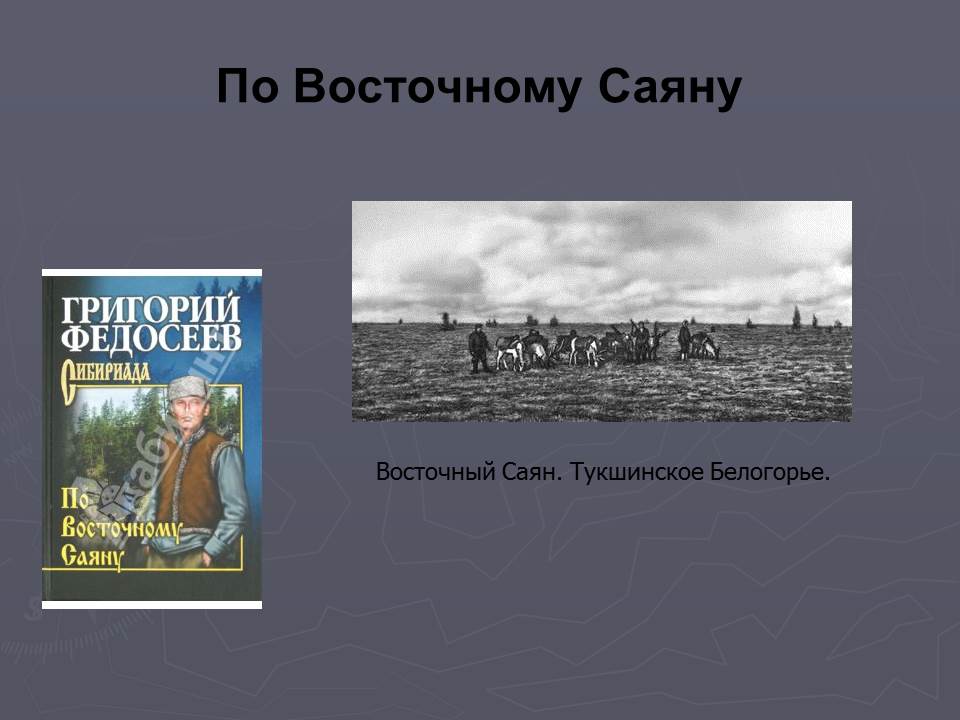 5 группа: «По Восточному Саяну». Это книга о людях высокого долга, готовых ради счастья другого человека рисковать своей жизнью в мирное время. Она о настоящих людях, о благородстве, целеустремлённости, дружбе, взаимовыручке, книга о неприступных скалах и непроходимой тайге, о диких животных. Это книга для тех, кто любит свою Родину, родную природу, животный мир. Красочно описывает автор животных – медведя, соболя, горностая, лося, марала, кабаргу и других, их борьбу за жизнь и существование в дикой природе. Григорий Анисимович Федосеев в своем произведении возвращает нас в далекий сейчас 1938 год, в полную опасностей геодезическую экспедицию ученых и исследователей... Данная повесть очень понравится любителям приключенческой прозы (демонстрируются рисунки животных, описанных в книге).