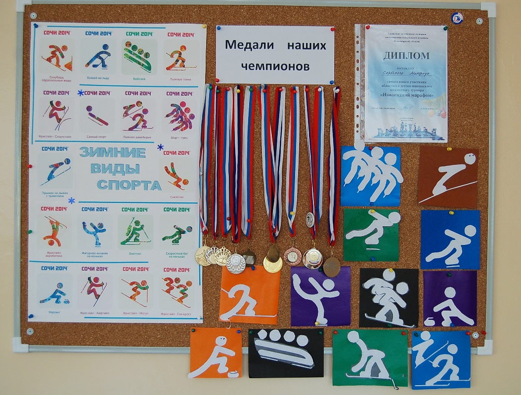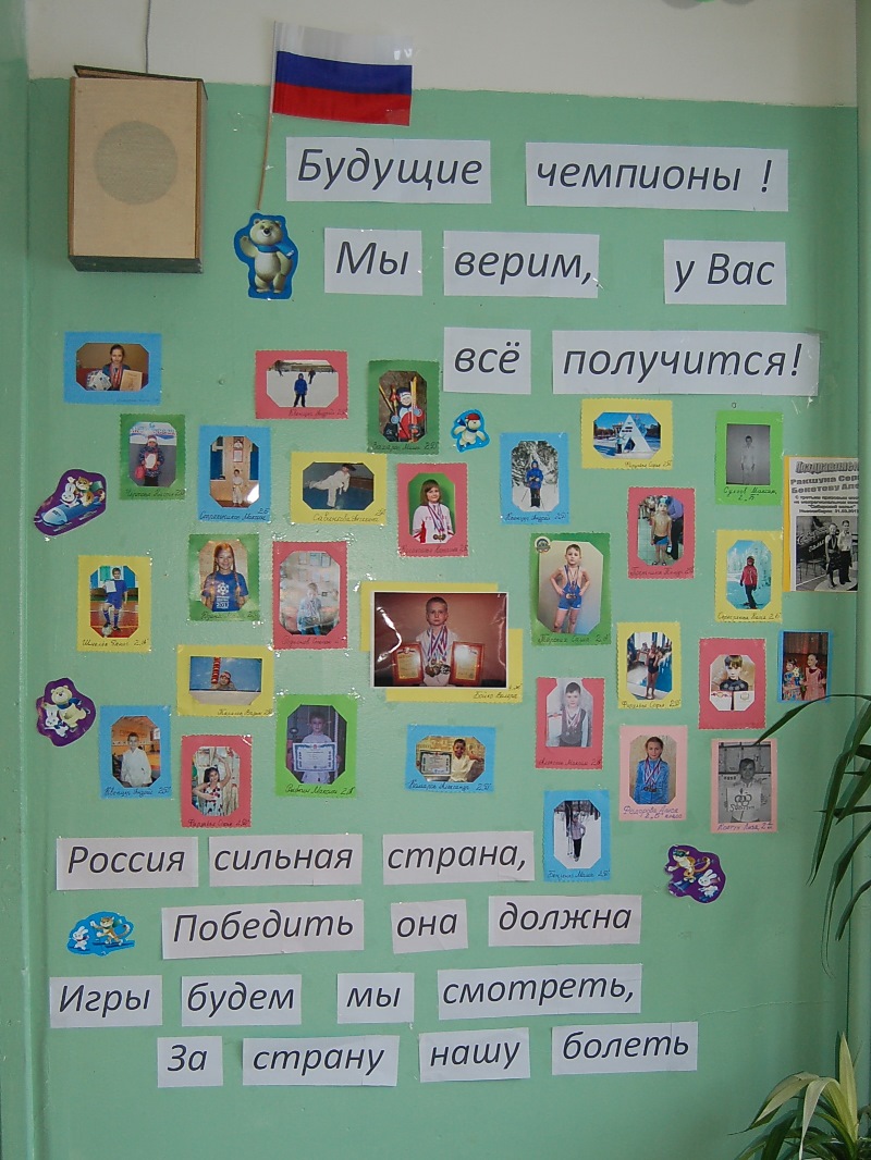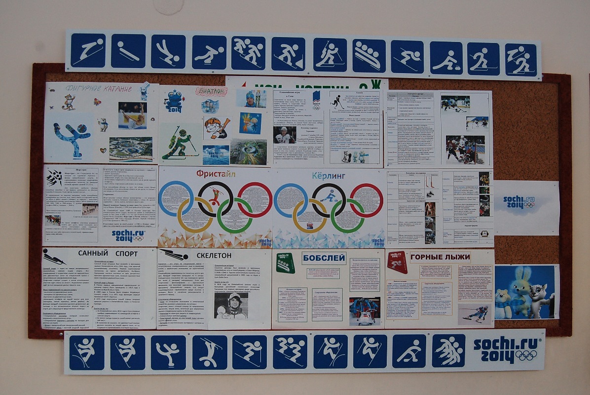 Очень большое внимание уделялось в прошедшем учебном году проведению зимней Олимпиады. В Младшей школе около каждого классного кабинета висит доска «Мои успехи», на которой красуются грамоты и дипломы наших учеников. Но во время акций и праздников эти доски превращаются в художественно-украшенные или информационные стенды. Так, во время проведения Олимпиады на стендах размещалась различная информация о зимних видах спорта, о символах Олимпиады, о знаменитых советских и российских спортсменах, таблицы учета медалей и многое другое. Нельзя было в это время быстро пройти по этажам Младшей школы. Взгляд останавливался на каждом стенде, хотелось прочитать и узнать как можно больше. С опытом проведения такой акции наши учителя выступали на Региональном этапе XII Международной ярмарки социально-педагогических инноваций (15.02.2014). Они представляли коллективный проект «От школьных побед к олимпийским вершинам», который вызвал огромный интерес зрителей.