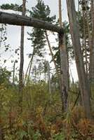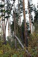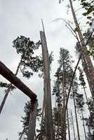 При таком подъёме не было возможности не то что качественно произвести съёмку, но и вообще ступить на землю. Насколько это было возможно в данных условиях, я сделала детальную съёмку места падения метеорита. Сфотографировала завалы из сухих упавших деревьев, странные следы на стволах сосен, словно спички, переломанные пополам или расщеплённые деревья.