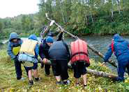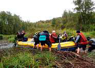 Но всё было напрасно: тополь оставался на месте. Тогда Н.Н. принял решение протащить рафт поверх ствола. Так и поступили: все члены команды кроме капитана и Виталика остались на берегу. Ребята во главе с Алексеем проволокли рафт за чалку над стволом тополя, Н. Н. при этом задавал на корме направление движения судна. Таким образом, выбрались из плена.