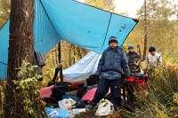 Остановившись вечером на бивуак, мы натянули лагерный тент и разложили два костра: один для приготовления пищи, другой для обогрева и просушки вещей. Впрочем, просушиться в тот вечер у нас не было никакой возможности: сверху постоянно лило и то, что сохло от костра, сейчас же снова промокало под дождём.