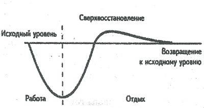 После нагрузки не просто восстанавливается всё затраченное организмом в процессе деятельности, но в результате усиленного анаболизма происходит развитие и дальнейшее усложнение структур всех работающих органов и систем организма. Каждый очередной цикл возбуждения клетки сопровождается в восстановительный период избыточным накоплением в ней пластических и энергетических материалов выше исходного уровня – супервосстановление, без которого рост и развитие организма были бы не возможны.