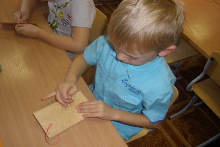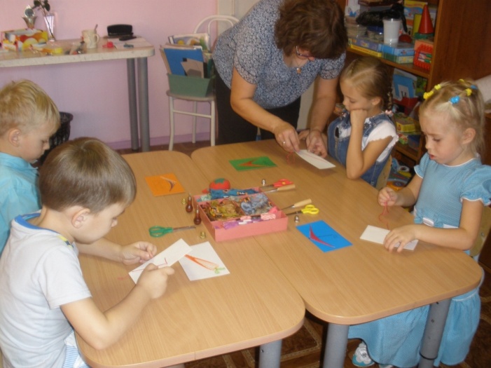 В рамках деятельности по использованию техники «Рисование нитью» организуются и проводятся занятия, построенные по принципу усложнения заданий и ориентации детей на практическую значимость продуктов их деятельности (участие в творческих выставках, оформление работ в виде подарков близким людям и т.д.). Занятия проводятся индивидуально, с подгруппой по 2-4 человека (15-20 минут), так как работа с иглой требует соблюдения правил техники безопасности и повышенной концентрации внимания ребенка. Работу с детьми на занятиях условно разделила на две части: актуализация освоенного материала, введение новых элементов в технике «Рисование нитью».
