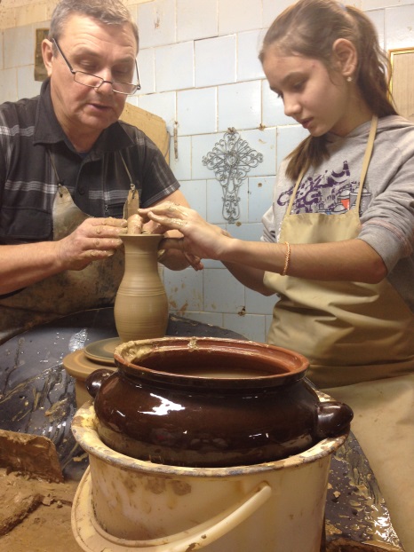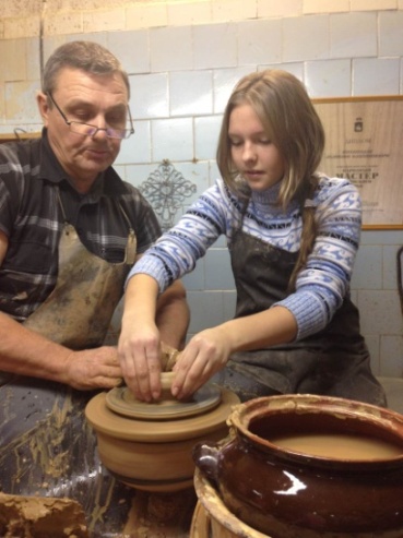 Надев фартук и сев за гончарный круг, каждый ребёнок сделал собственную вазу или цветочный горшочек. Ребята фантазировали, стараясь сделать свою поделку оригинальной. Спрашивали у мастеров о различных приёмах, которые помогут сделать края вазы волнистыми или изогнутыми, получить вазу высокую или круглую.