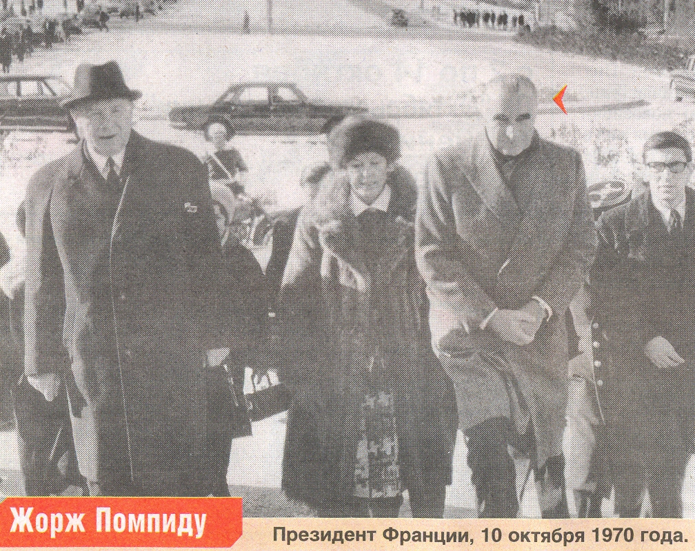 На снимке: Президент Жорж Помпиду с супругой и сопровождающими входит в Дом Ученых. Машина с киносъемкой стоит за кадром справа (Фото Рашида Ахмерова, газета «Метро» 10-17 октября 2007)