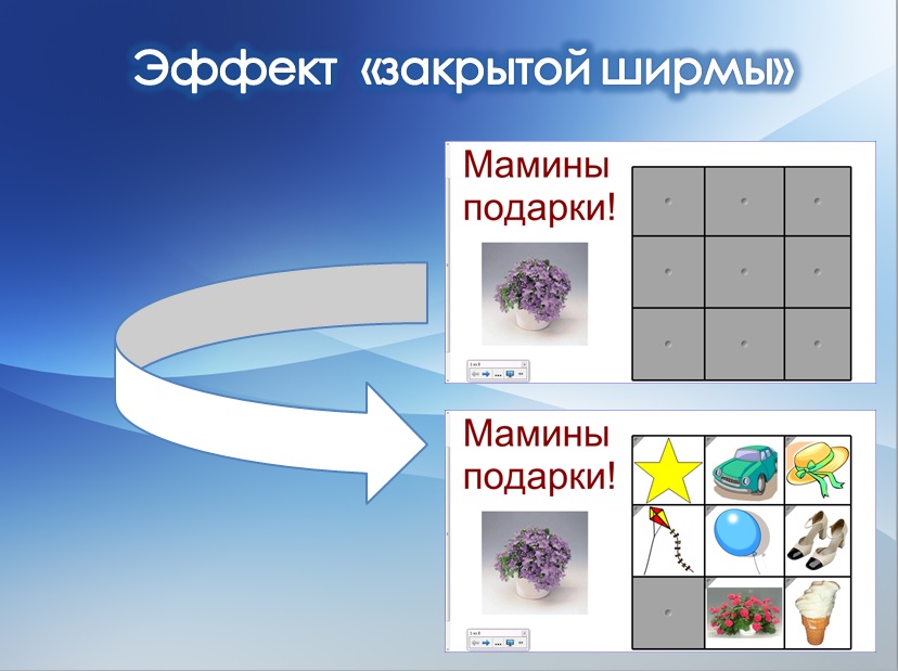 – использую эффект «закрытой ширмы» для организации сюрпризного момента;