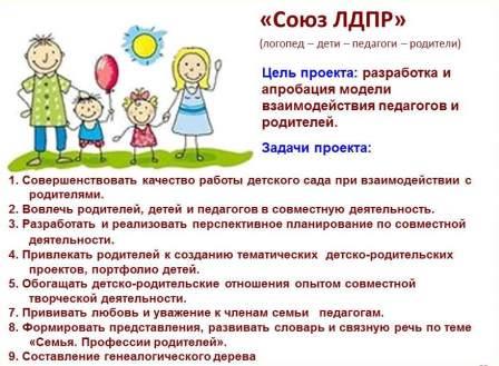 Всю нашу работу по взаимодействию с родителями и детьми мы описали в педагогическом проекте «Союз ЛДПР» (союз логопеда, детей, педагогов, родителей).