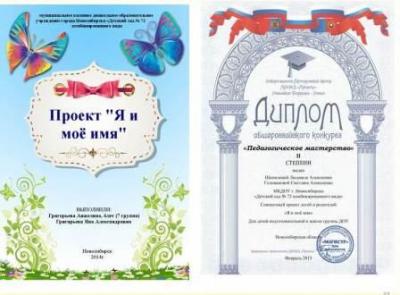 Заинтересовав детей вопросом происхождения своего имени, в группе создали много детско-родительских проектов по теме «Наши имена», где один из них был отмечен дипломом II степени общероссийского конкурса.