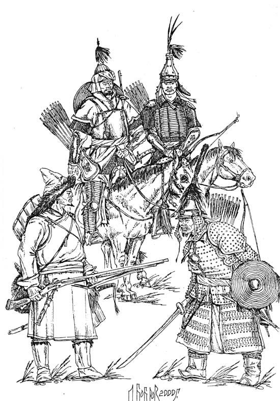 Стоят джунгарский (ойратский) мушкетёр XVII – перв. пол XVIII.в.; кашгарский воин джунгарской армии. Всадники: джунгарский военачальник XVII в. халхасский военачальник в маньчжурских доспехах. (Слева направо)